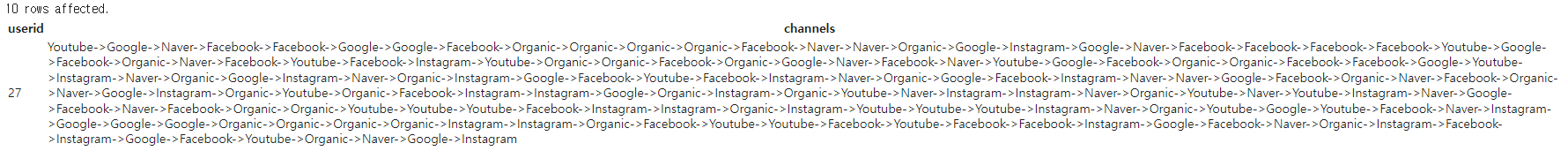 SELECT userid, LISTAGG(channel, '->') WITHIN GROUP (ORDER BY ts) channels