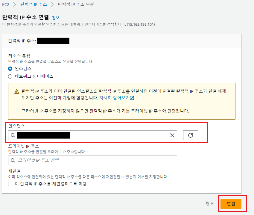 탄력적 IP를 할당 할 인스턴스를 선택한 뒤 연결 버튼을 클릭합니다.