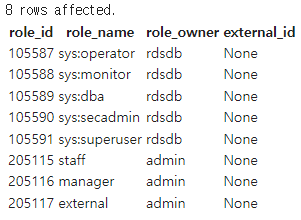 GRANT ROLE staffs TO ROLE managers; # staffs라는 역할을 managers라는 역할에게 부여(상속 or 계승)