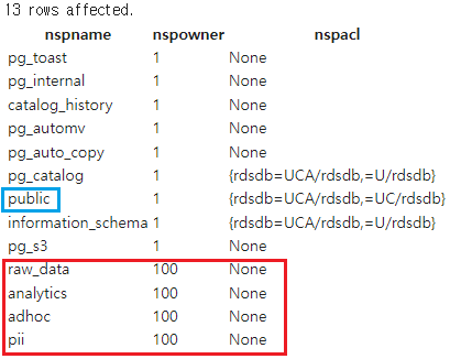그런데 우리가 방금 생성한 빨간색 박스의 4개의 스키마들외에도 다른 9개의 스키마들이 있는데 이는 Redshift에서 기본적으로 같이 생성한 스키마들입니다. 이들 중 몇가지는 추후에 사용하며 설명하겠습니다.