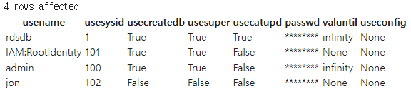 rdsdb와 IAM:RootIdentity라는 사용자가 있음을 볼 수 있습니다.