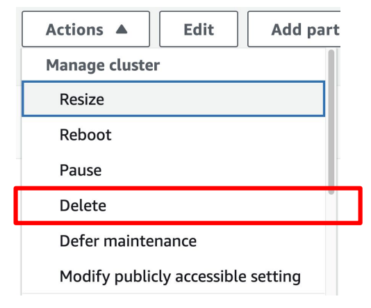 Redshift 콘솔에서 삭제할 클러스터를 선택하고 상단 메뉴에서 Delete 선택