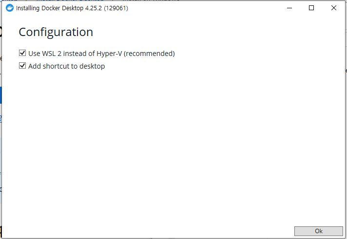 Use WSL 2 instead of Hyper-V (recommended)는 체크해주세요.