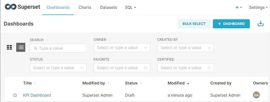 Dashboards 메뉴에 가보니 우리가 방금 만들고 크기를 수정한 KPI Dashboard가 보입니다. Superset Admin이 생성했다는 Owners 표시도 보이네요.