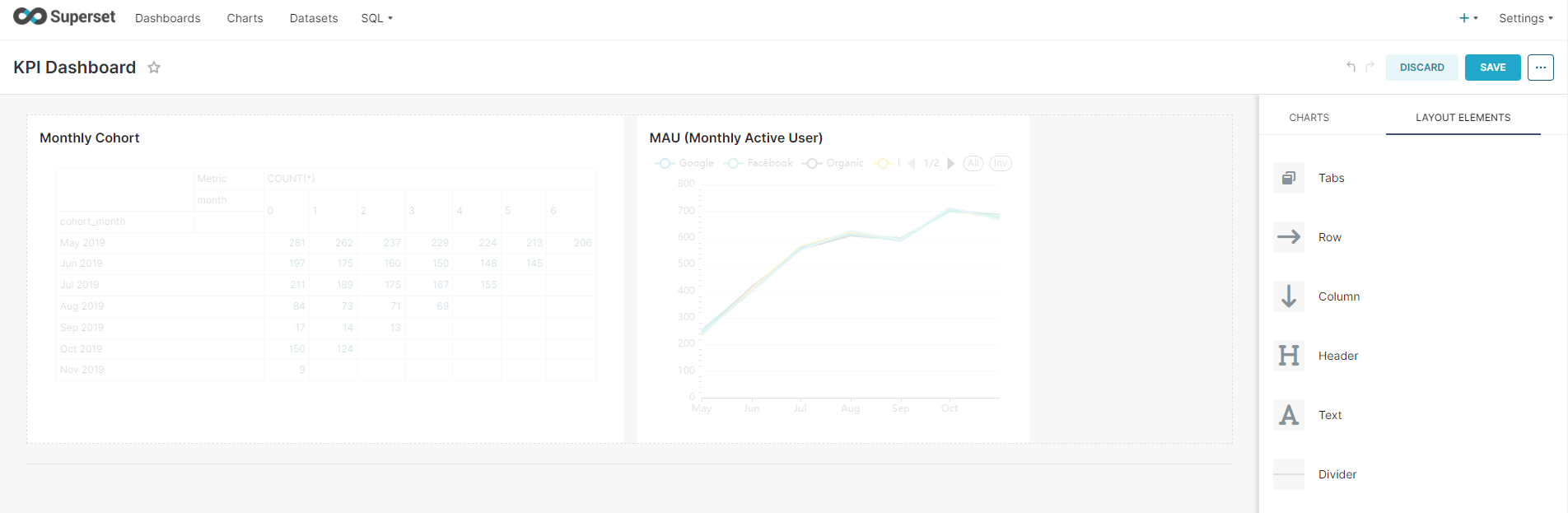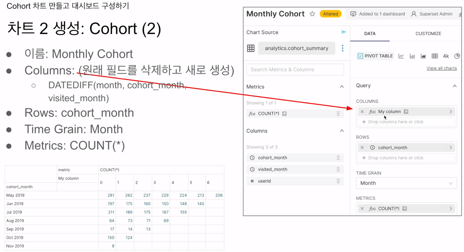 이번 시간에는 Cohort 차트를 만들고 이전에 만든 MAU 차트와 합쳐 하나의 대시보드를 만들려고 합니다.