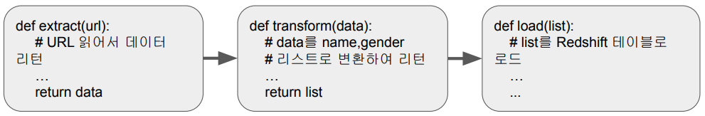 3개의 함수를 각각 별개의 태스크(Airflow에서는 task 단위로 나누어 작업을 수행합니다.)로 구성할 수도 있고 하나의 태스크 안에서 3개의 함수를 모두 호출하게 구성할 수도 있습니다.