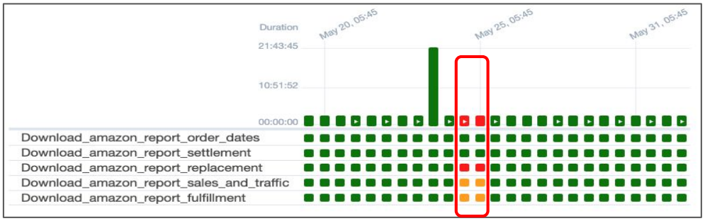 아마존 리포트 데이터를 가져오는 Daily DAG에서 5월24일~5월25일 DAG가 실패했는데 데이터 웨어하우스에는 이틀치의 데이터들이 담기지 않은 상태입니다. 이와 같은 일들은 데이터 엔지니어들에게 굉장히 자주 발생하며 이를 최대한 방지하고 만회하는 것이 데이터 엔지니어들에게 요구되는 매우 중요한 역량입니다.