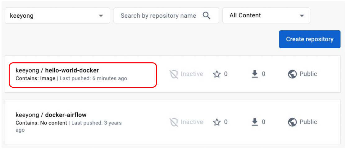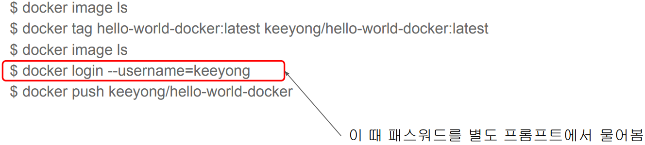 docker login으로 keeyong/hello-world-docker repo에 접근 가능한 것을 증명하고