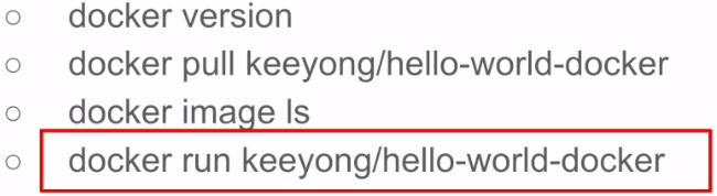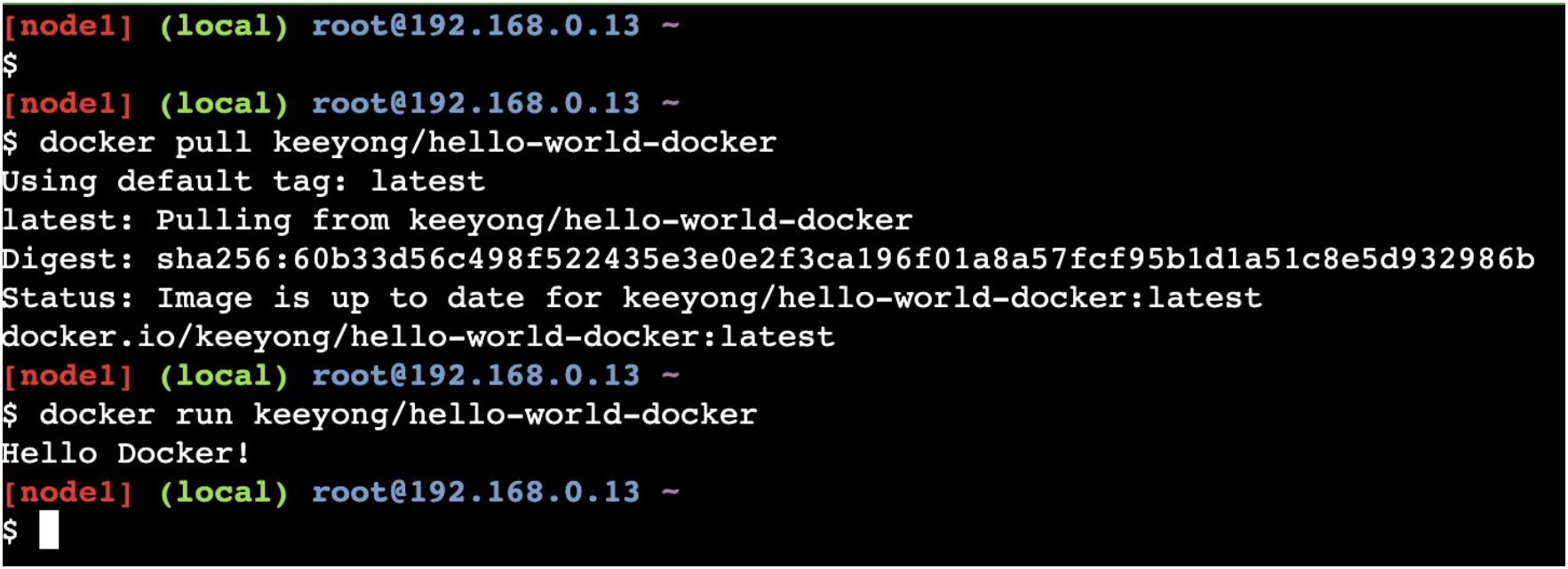 keeyong/hello-world-docker repo에 이미 이미지를 업로드 했습니다. 그리고 이미 Docker Hub로 로그인을 한 다음이기 때문에 서버는 이미 repo에 대한 접근 권한이 있다는 것을 알고 있어 docker login과 같은 과정이 필요 없고 pull을 진행하면 됩니다.