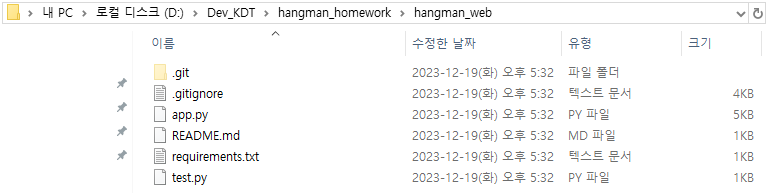 그러면 hangman_homework 디렉토리 아래에 hangman_web으로 repo가 하나 생성될 것입니다.