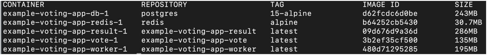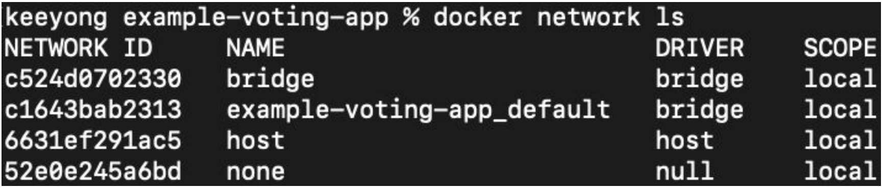docker-compose.yml 파일이 속한 폴더의 이름이 원래 이미지 이름인 worker, vote, result 컨테이너 앞에 prefix로 붙은 모습입니다.