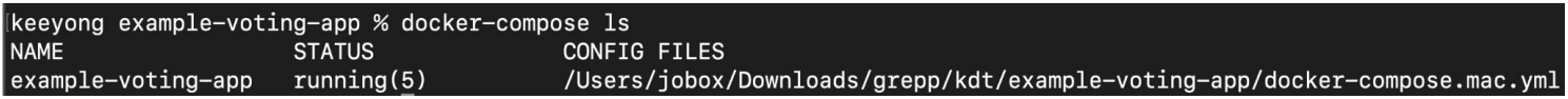 이미지에서는 example-voting-app이라는 docker-compose로 관리되는 소프트웨어가 조회되는군요. 현재 5개의 Containers가 실행 중이고 config files의 위치도 조회됩니다.