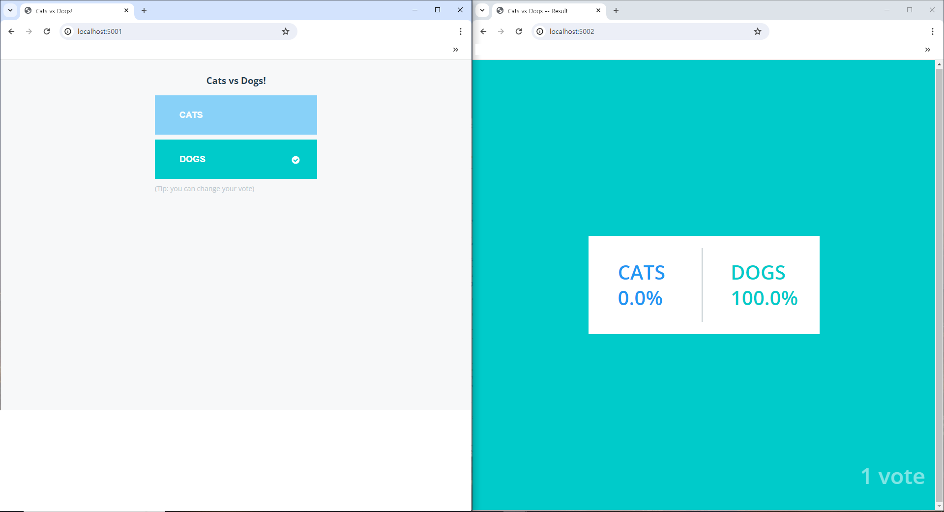 오른쪽은 투표 결과를 보여주는 result 앱 (포트 5002)입니다.