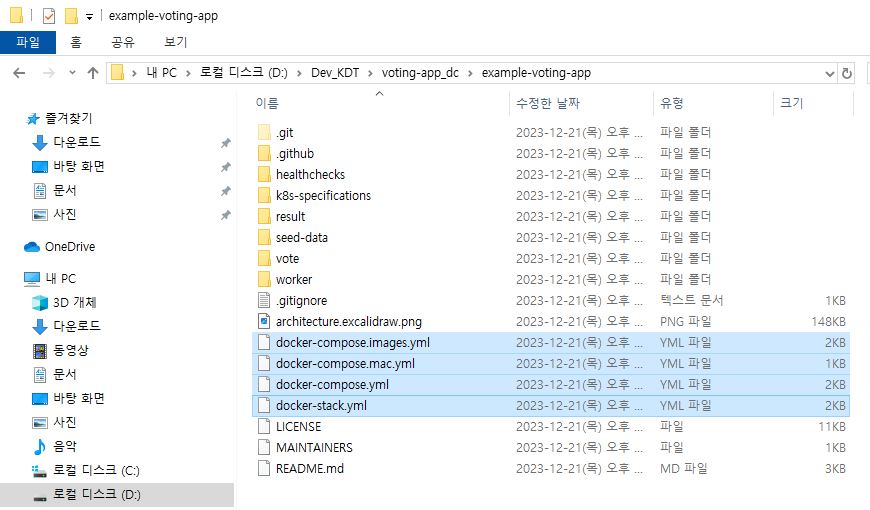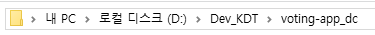 저는 D드라이브의 Dev_KDT에 voting-app_dc라는 디렉토리를 만들고 이곳에 git clone과 기타 docker-compose 관련 실습을 진행하겠습니다.