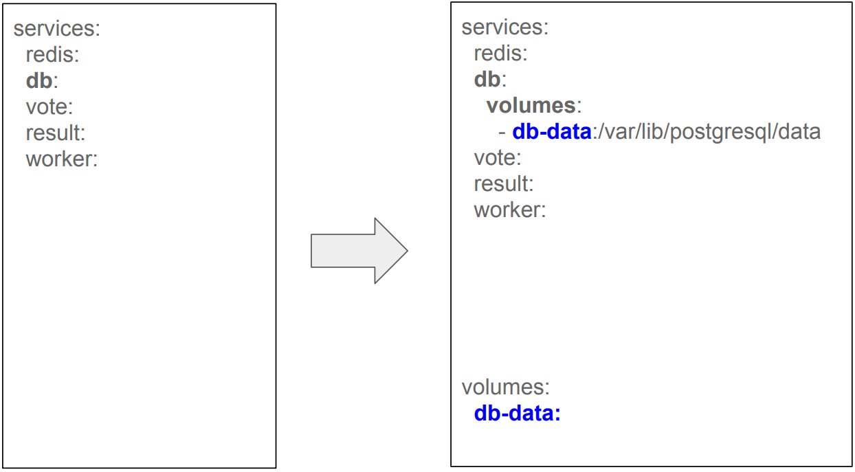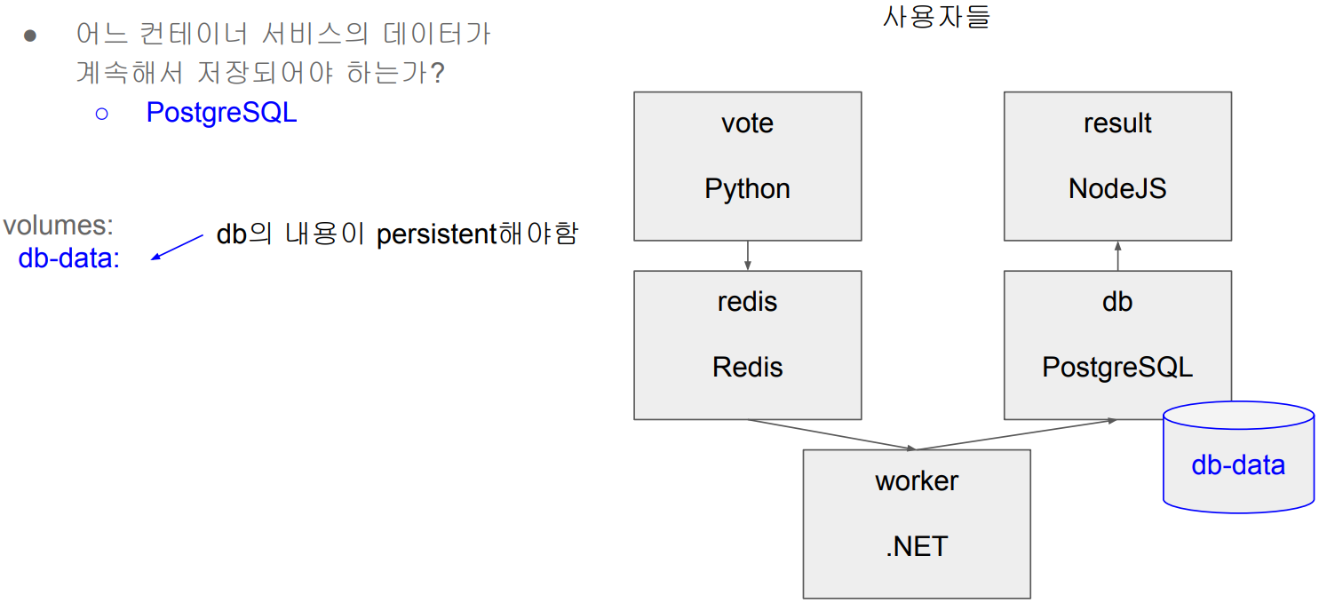 서비스들이 stop, remove, restart에도 데이터들이 계속 보관되도록 volume을 정의할 것입니다.
