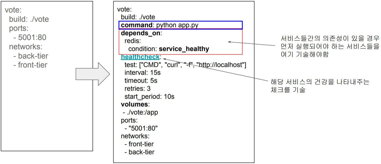 빨간색 박스 depends_on의 내용은 vote 서비스는 docker container로 실행되려면 redis가 먼저 docker container로 서비스되어야 한다는 뜻입니다. condition:을 추가하면 redis가 먼저 실행되는 것은 물론 redis의 실행 상태가 건강(healthy)할 때만 vote라는 서비스가 실행되도록 해줄 수 있습니다.