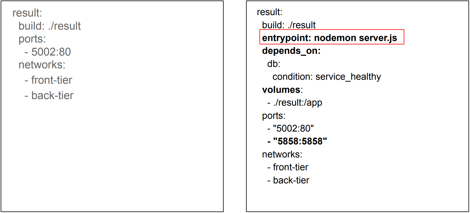 result 서비스는 ./result 디렉토리의 Dockerfile을 쓸건데 사용할 Dockerfile에는 entrypoint라는 변수가 있고 그 entrypoint를 새로운 값 nodemon server.js로 override 하겠다는 뜻입니다.