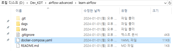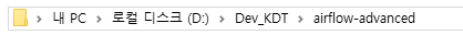 저는 D드라이브에 Dev_KDT 아래에 airflow-advanced라는 폴더를 만들었습니다.