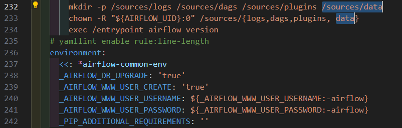 airflow-init 섹션에서 기존에 있던 logs, dags, plugins 3개에 더해 data를 추가합니다.