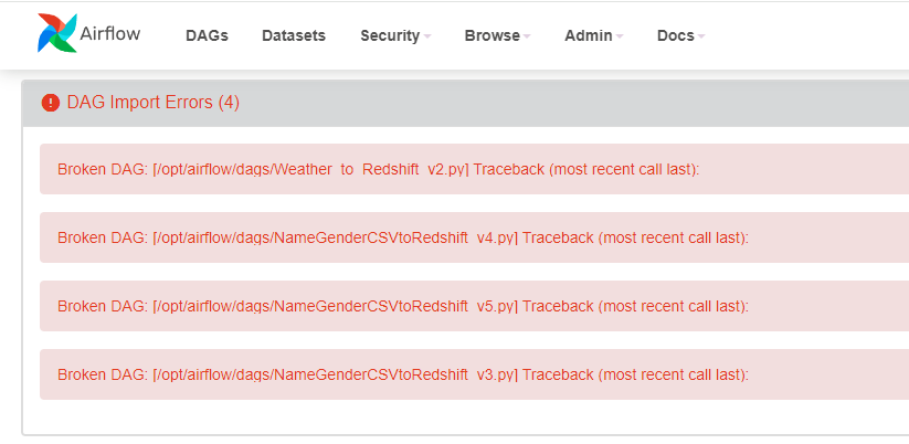 설치가 끝난 후에 브라우저에서 로그인을해보면 DAG 에러가 몇 있습니다