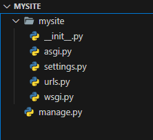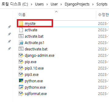 그러면 위와 같이 활성화중인 가상환경 디렉토리에 mysite라는 폴더(+ 파일들)가 만들어짐을 볼 수 있습니다.