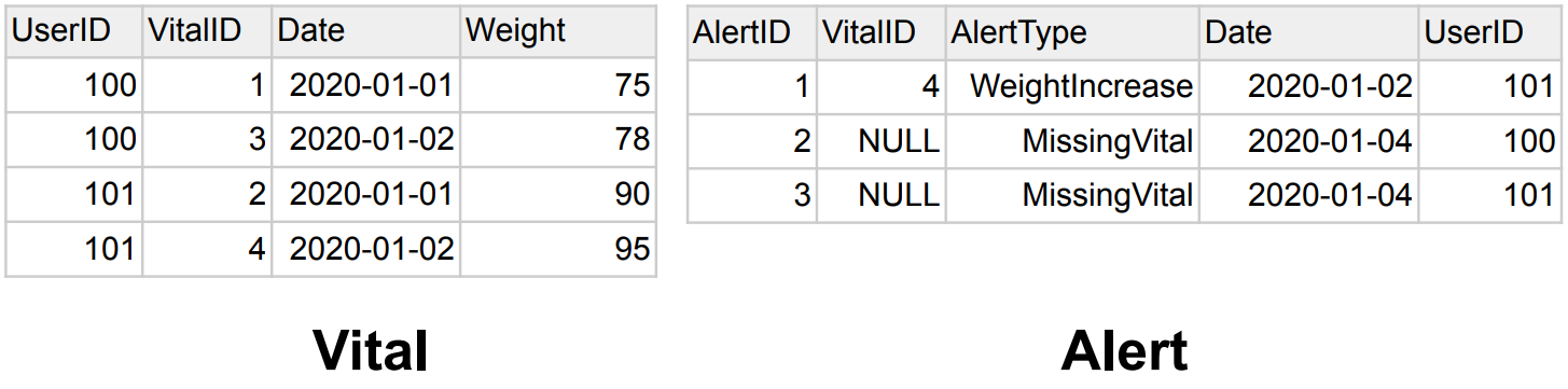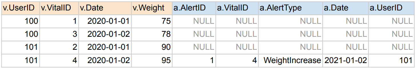 JOIN Alert a ON v.vitalID = a.vitalID;