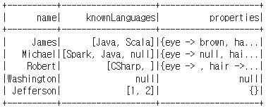 df = spark.createDataFrame(data=arrayData, schema = ['name','knownLanguages','properties'])