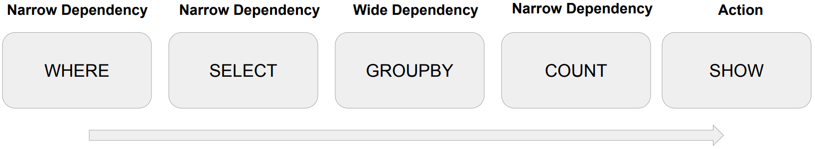 로딩이 된 순간 데이터 프레임은 하나 혹은 그 이상의 파티션으로 구성됩니다. 그 이후에 WHERE와 SELECT를 수행하는데 이 때 필터링인 WHERE와 SELECT 작업은 해당 파티션에서 가능한 작업(Narrow Transformation)입니다. 셔플링이 필요가 없습니다. executor에서 진행되는 task들이 독립적으로 작업을 수행할 수 있습니다.