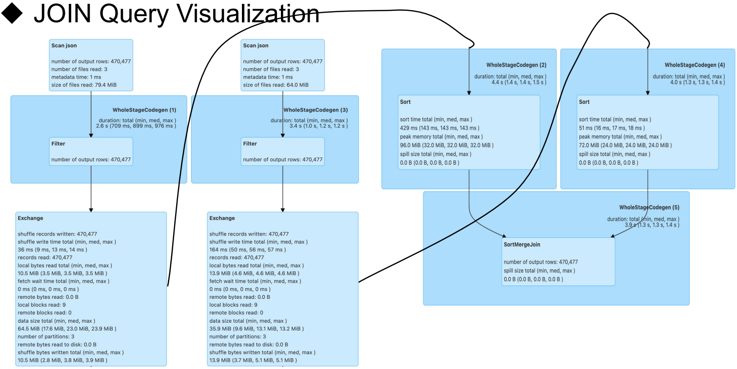 SparkSQL 챕터에서 살펴본 JOIN 방식 중 Shuffle Hashing JOIN이 발생할 겁니다. 만일 df_small이 충분히 작다면 굳이 그 방식을 사용하는 것은 엄청난 낭비일 것입니다. Broadcasting JOIN이 더 적합하며 지금의 Shuffle JOIN의 시각화를 살펴본 후 이어서 Broadcast JOIN으로 넘어가겠습니다.