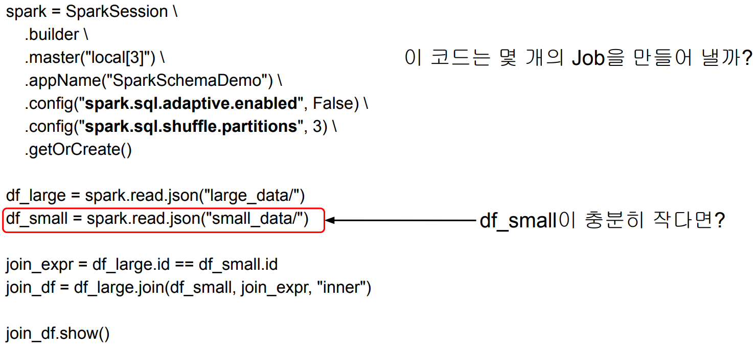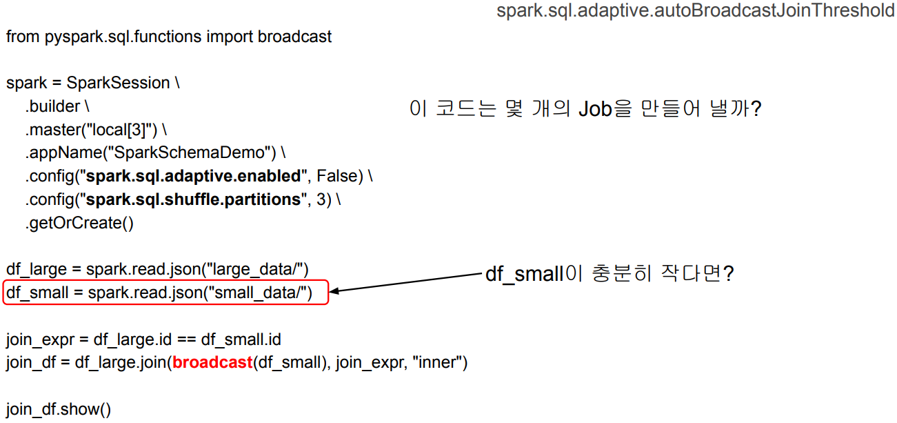 broadcast를 명시한 것 빼고는 나머지 모든 코드가 동일합니다. 명시하는 함수 호출 방법 외에도 옵션 설정으로 Spark이 알아서 최적화하며 작은 데이터 프레임을 broadcast하도록 할 수 있는데 그 때 사용하는 configuratioin이 spark.sql.adaptive.autoBroadcastJoinThreshold입니다. byte 크기이며 byte 크기 보다 작을 때 broadcast하게 됩니다.