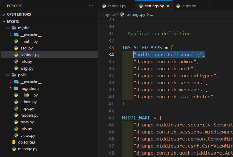 와 같이 polls.apps.PollsConfig를 입력해 앱을 등록하시면 됩니다.
