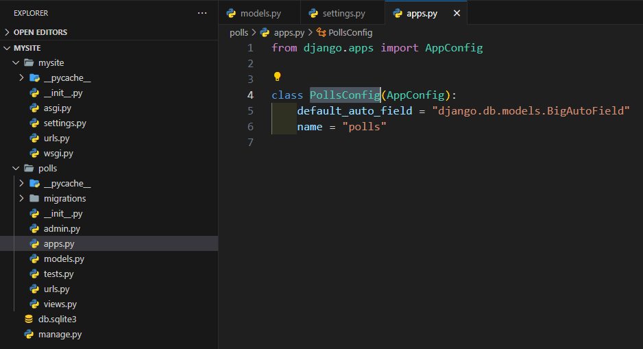 바로 우리가 모델을 만들었던 앱인 polls의 app.py 파일의 AppConfig를 상속 받아 만들어져있던 클래스의 이름으로