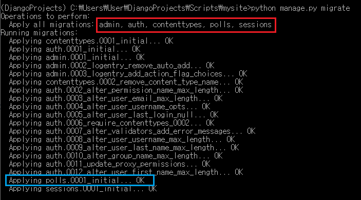 (DjangoProjects) C:\Users\User\DjangoProjects\Scripts\mysite>python manage.py sqlmigrate polls 0001