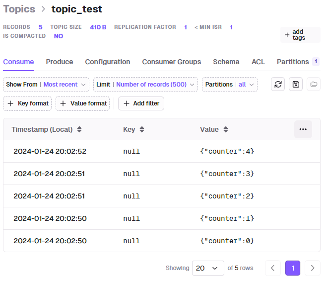 우측 하단을 보면 의도한대로 topic_test가 보입니다. 0부터 4까지 Count는 5로 잡힙니다.