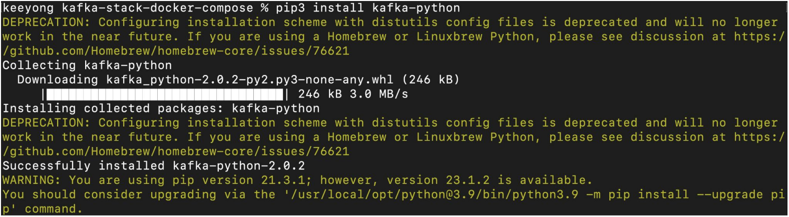 Kafka 컨테이너 내부가 아닌 본인의 로컬에서 pip3 install 해주세요!