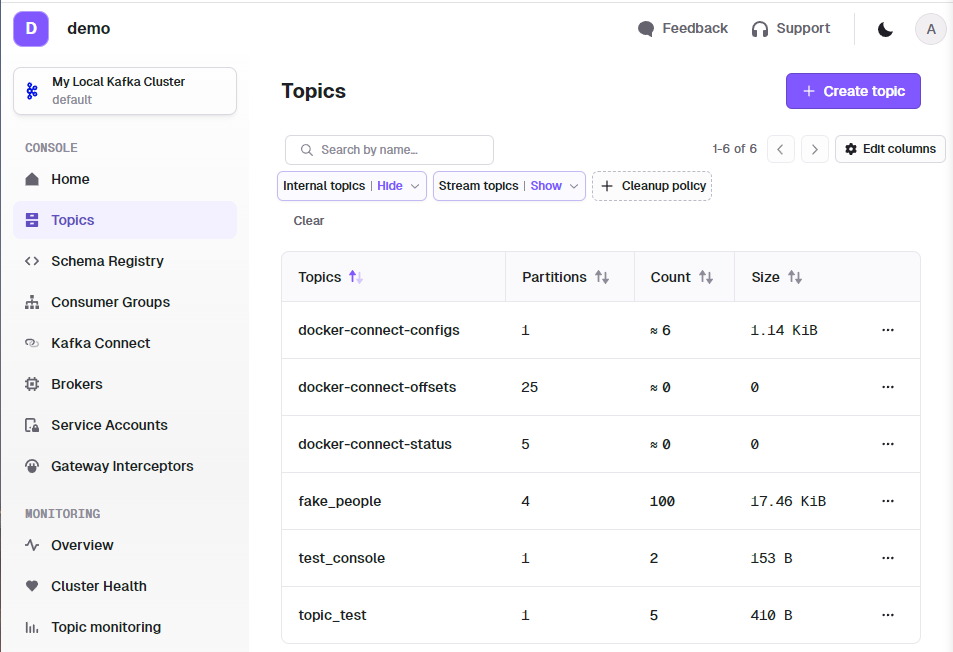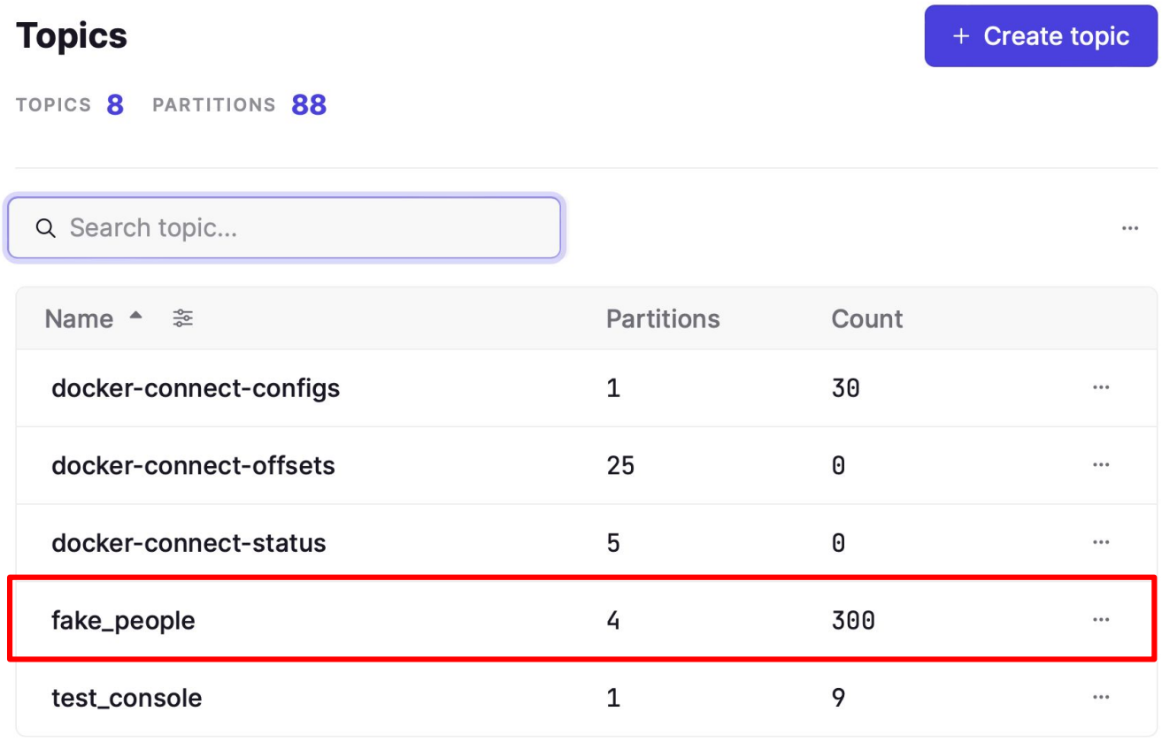 Web UI에서 Topic을 확인해보니 fake_people이 보이고 for문이 100번 돌며 Count가 100인 것을 볼 수 있습니다.