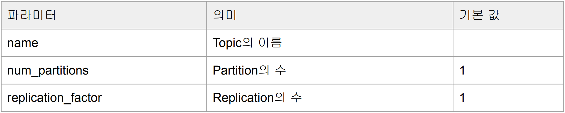 Topic의 이름인 name, 파티션의 수인 num_partitions, 복제분의 수인 replication_factor입니다.