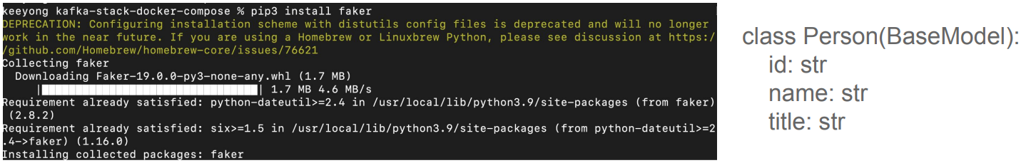 랜덤한 사람 정보를 위해 faker 모듈을 로컬에 설치할 겁니다. KafkaProducer는 Kafka Cluster안에서 돌 필요가 없으므로 로컬 PC 터미널에서 faker를 pip install합니다.