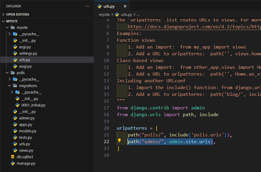 (프로젝트)mysite 폴더의 (프로젝트와 동명의)mysite 폴더 내에 urls.py를 보면