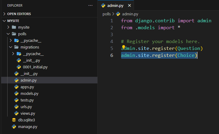 polls 디렉토리에는 polls 앱 생성시 같이 자동생성 되었던 admin.py파일이 존재합니다.