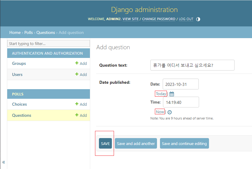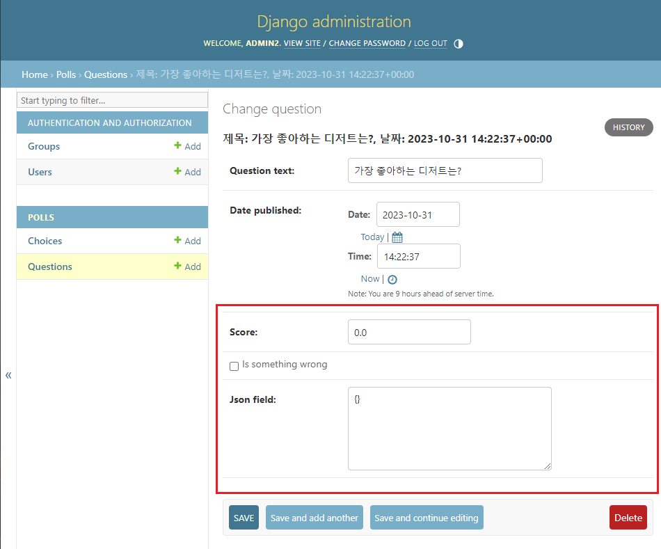 어드민 페이지에서 제공된 입력폼에 새로운 question을 입력해 보겠습니다.