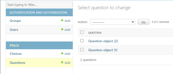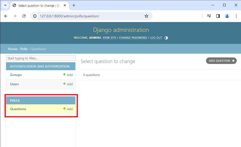 어드민 페이지를 새로고침하면 POLLS앱의 Questions 모델이 새로 잘 등록되었음을 확인할 수 있습니다.