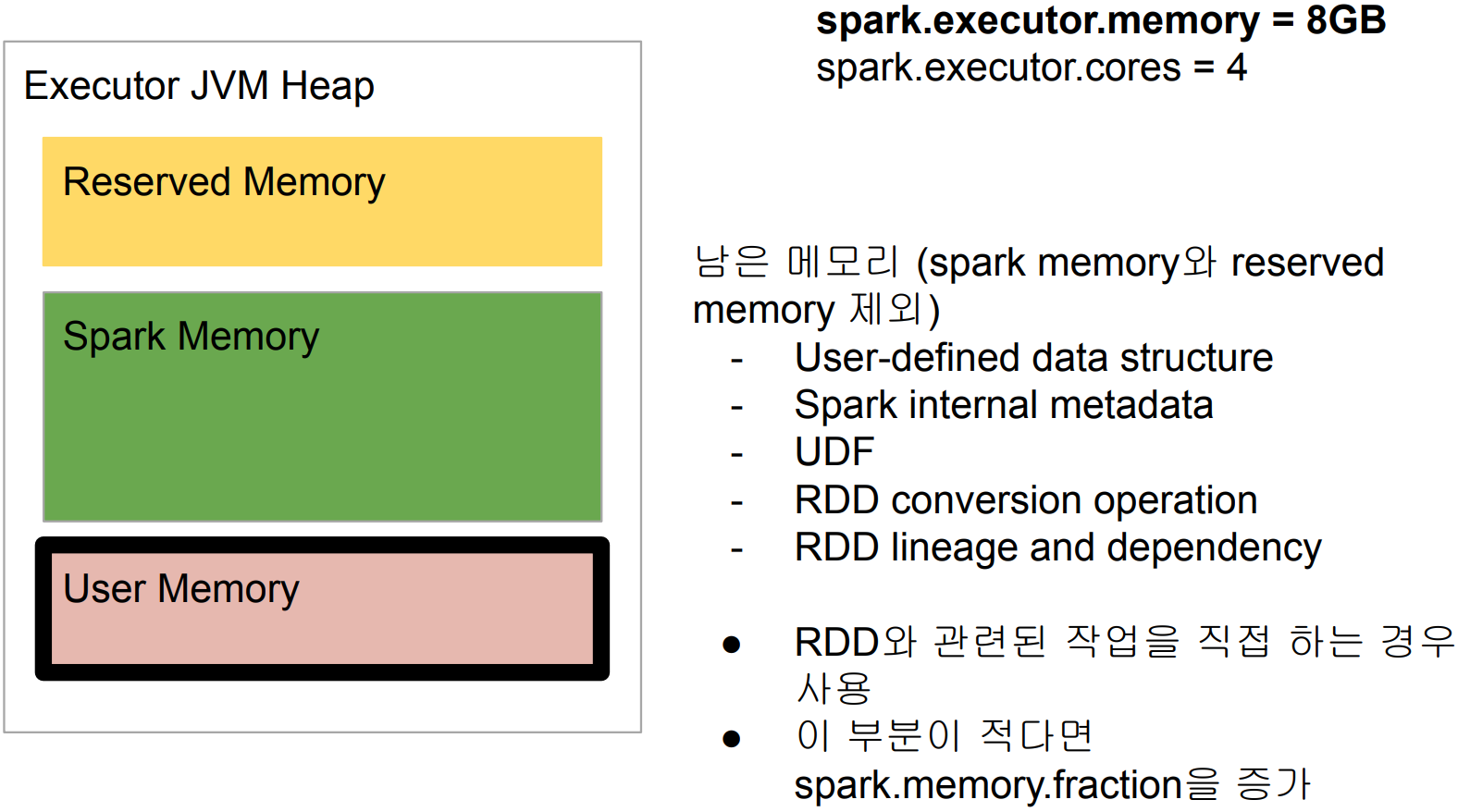 ● spark.offHeap.size를 사용해서 executor memory의 증가없이 off heap 메모리 증가가 가능