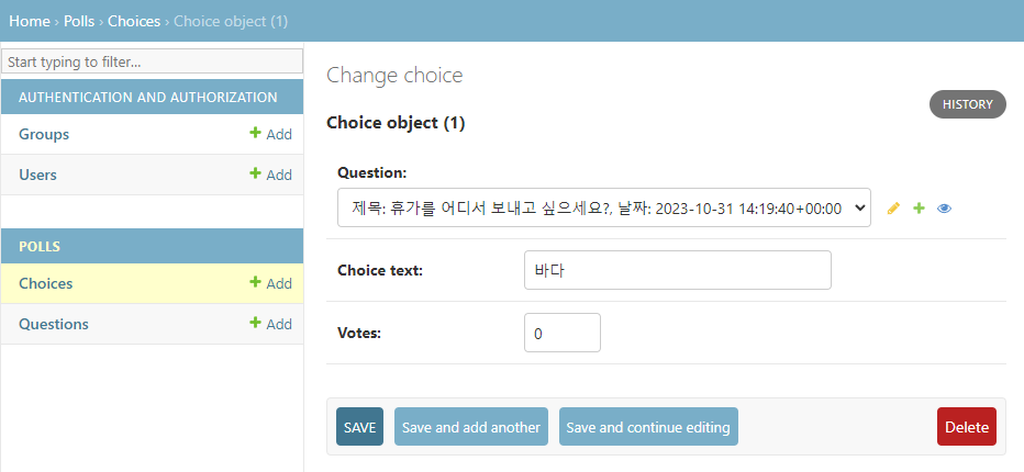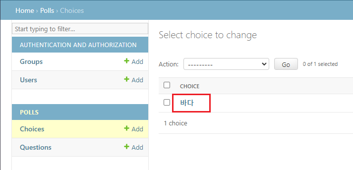 어드민 페이지에서 Choice에 데이터들을 추가해봅시다.