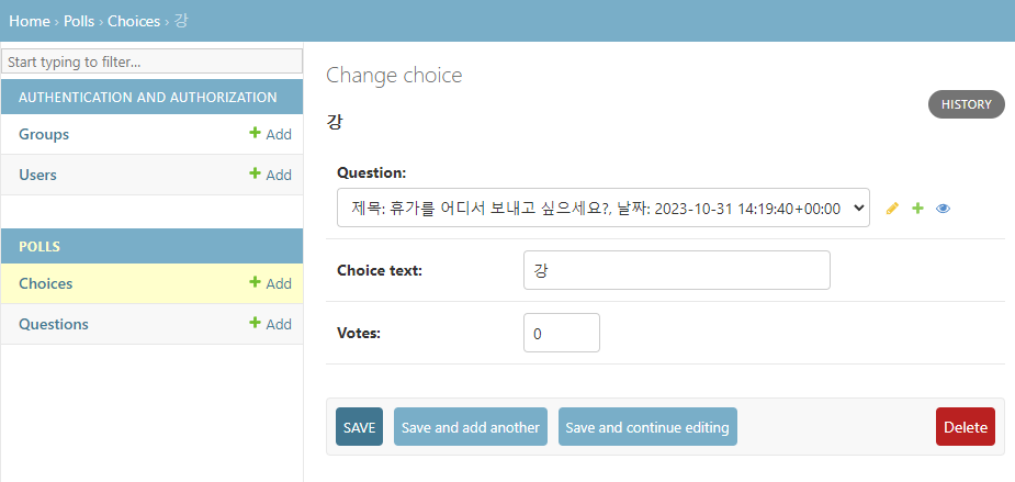 어드민에서 Choice 모델에서 '휴가를 어디서 보내고 싶으세요?'에 대한 Question을 참조하는 '강'이라는 데이터를 추가한 후