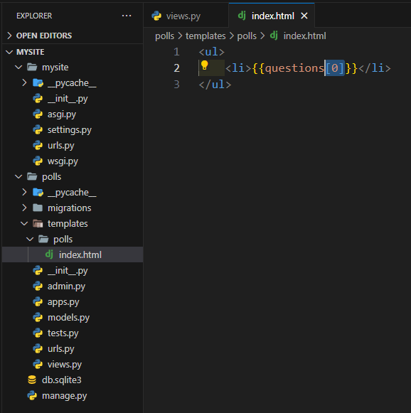 템플릿에서 건네 받은 context의 키 question을 이용해 인덱싱 [0]으로 접근하면 쿼리셋들 중 첫번째 값이 나올까요?