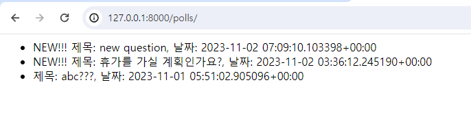 우리가 템플릿의 {% else %}에서 봤듯이 no question이 출력되는 것을 볼 수 있습니다.