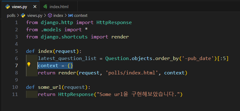 지난 시간에는 context에 first_question 키에 가장 최근의 question 한개만 인덱싱 [0]으로 담아 보냈지만