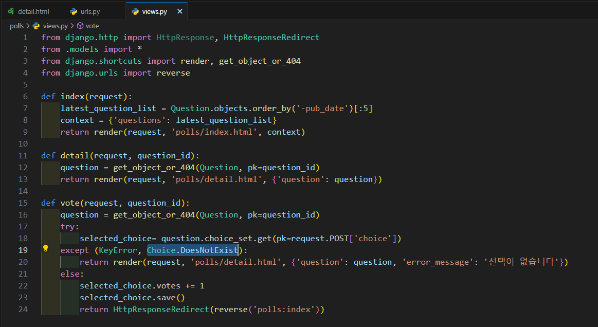 그런데 Choice.DoesNotExist도 같이 에러 방어 코드로 작성해줬는데 왜 그랬을까요?