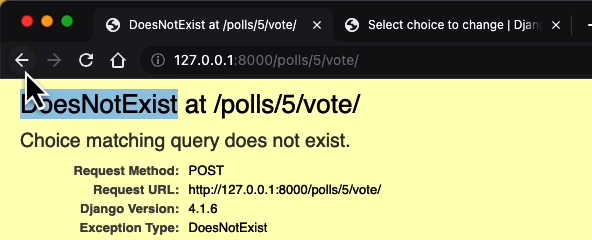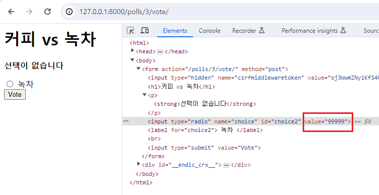 question의 상세 페이지에 들어가 투표할 때는 무조건 존재하는 choice들만이 선택지로 제공될텐데 굳이 저렇게 Choice.DoesNotExist까지 방어 코드로 작성할 필요가 있을까 의문이 드실 수도 있습니다. 그런데 한 가지 상황을 가정해 보겠습니다.